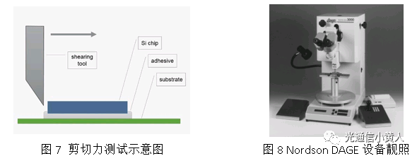 從外觀上,一般會在顯微鏡下觀察溢膠情況,比如要求至少有三邊溢膠。暴力的評價手段是用專用設(shè)備上的劈刀直接在芯片側(cè)面施加推力,測量將芯片推下來需要的最小用力,同時觀察載體上的芯片殘留情況,叫做剪切力測試,標準方面行業(yè)內(nèi)一般參考美軍標MIL-STD-883 Method 2019 (DIE SHEAR STRENGTH)。剪切力的測量設(shè)備我知道的就只有Nordson DAGE這款,似乎已經(jīng)形成壟斷了,下圖是剪切力測試的示意圖和Nordson DAGE設(shè)備的靚照。