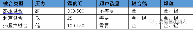打線按照鍵合能量可以分為熱壓鍵合、超聲鍵合、熱超聲鍵合三種,按照鍵合線的材料分為金絲、鋁絲、銅絲三種。光通信行業(yè)一般只用金絲熱超聲鍵合這一種,這是因為光電芯片的表面普遍都會鍍金,金的高頻性能好,而熱超聲鍵合的溫度比較低而且速度很快,可靠性更好。