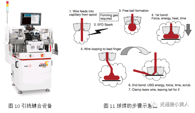 下面的圖片給出了光模塊生產(chǎn)工藝的幾個關(guān)鍵工序,其中貼片、打線、芯片老化這3個工序在半導體芯片后段制程中也有,網(wǎng)上能找到非常多的資料,后面4個則是由光學特性帶來的,資料相對來說少些。