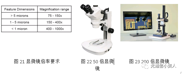 對于這類臟污問題,提高目檢顯微鏡倍率是一個常用閉環(huán)改善手段,MIL-STD-883里對顯微鏡倍率也有定義,光通信行業(yè)內(nèi)芯片焊盤的直徑一般都在70um,使用1mil(25um)的金線,但如果考慮到臟污的特征尺寸,最好還是選擇100倍以上的顯微鏡進行目檢。只是這樣的顯微鏡比較貴而且檢測效率比較低,也有行業(yè)內(nèi)很多廠家使用是50倍以下的顯微鏡(顯微鏡的模樣有很大區(qū)別)來檢查金線外觀。