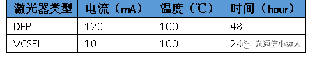 下面我們著重介紹管芯級激光器的burn in測試。對于不同類型的激光器,老化篩選的典型條件如下表,電流和溫度條件滿足“最大額度工作條件或在最大額度工作條件之上”原則,例如DFB激光器的正常工作電流一般是60mA,老化的電流是120mA。至于具體的溫度、電流、時間條件,一般是由激光器芯片廠家經(jīng)過大量試驗后確定下來的。