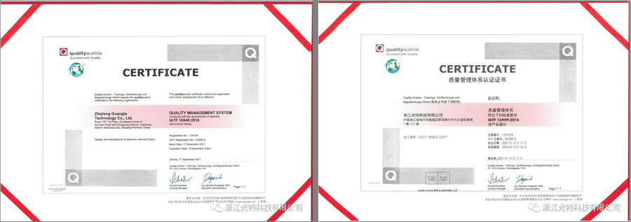 ICC訊 12月17日,IATF認證機構正式給浙江光特科技有限公司(簡稱光特科技)頒發(fā)了IATF16949認證證書,標志著光特科技的光芯片產品獲得進入汽車市場的綠色通行證,為其積極開拓車載激光雷達(LiDAR)芯片產品市場奠定堅實的基礎。