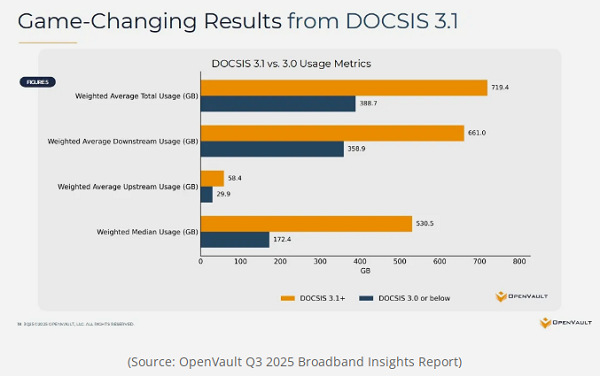 ICC訊 盡管DOCSIS 3.1主導(dǎo)有線(xiàn)寬帶(Cable Broadband)領(lǐng)域并不出人意料,但我們?nèi)缃裼辛藬?shù)據(jù)來(lái)證明其優(yōu)勢(shì)。OpenVault的第三季度《寬帶洞察報(bào)告》在給出整體互聯(lián)網(wǎng)使用情況的常規(guī)發(fā)現(xiàn)之余,重點(diǎn)對(duì)比了基于DOCSIS 3.1和傳統(tǒng)DOCSIS 3.0技術(shù)的寬帶使用量,結(jié)果顯示出顯著差距。