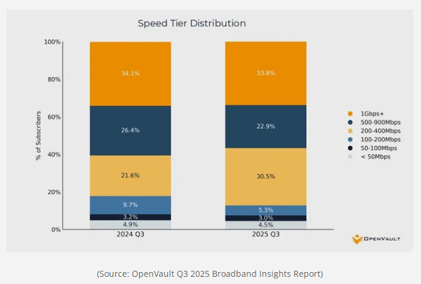 此外,雖然開(kāi)通1 Gbit/s或以上速度的家庭數(shù)量略有增加,但目前已經(jīng)形成了一個(gè)“最佳點(diǎn)”,即寬帶用戶(hù)開(kāi)通的速度在200 Mbit/s至400 Mbit/s之間。在2025年第三季度,開(kāi)通100 Mbit/s或以下速度的用戶(hù)降至僅7.5%。