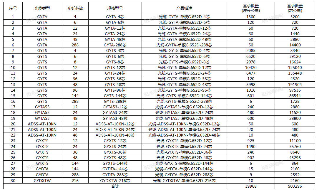 本次招標覆蓋山東省十六地市,共30種型號室外光纜,涵蓋GYTA、GYTS、GYTA53、ADSS、GYXTS、GYDTA、GYDXTW七大系列,芯數自4芯到288芯,光纖均為G.652D單模。其中,GYTS-12芯需求最大,達125040芯公里;GYTS-24芯、GYTS-48芯緊隨其后,分別為155448芯公里、191904芯公里。