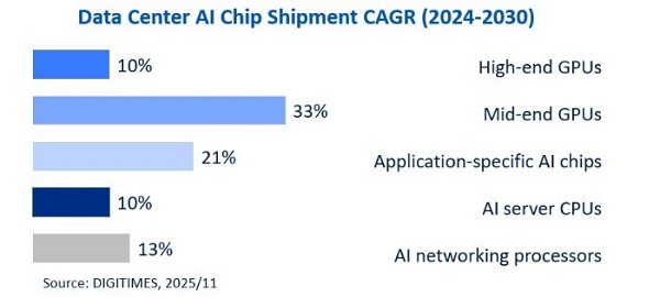 ICC訊——根據(jù)DIGITIMES Asia發(fā)布的最新報(bào)告,全球數(shù)據(jù)中心AI芯片出貨量預(yù)計(jì)將從2024年的3050萬片增長(zhǎng)至2030年的5340萬片。此類數(shù)據(jù)中心AI芯片包括高端和中端GPU、專用AI芯片(如Google的TPU)、AI服務(wù)器CPU,以及網(wǎng)絡(luò)/互聯(lián)相關(guān)芯片(例如交換機(jī)ASIC/機(jī)架級(jí)互聯(lián)芯片/DPU和NIC)。