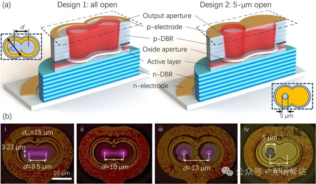 ▲圖2(a)雙VCSEL耦合結(jié)構(gòu)示意圖,(b)5μm孔徑實(shí)物圖。