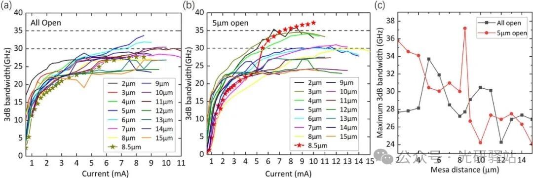 ▲圖4 不同VCSEL間距以及不同電流下的帶寬對(duì)比