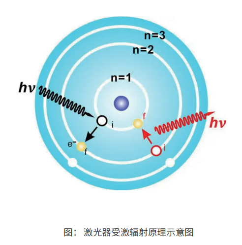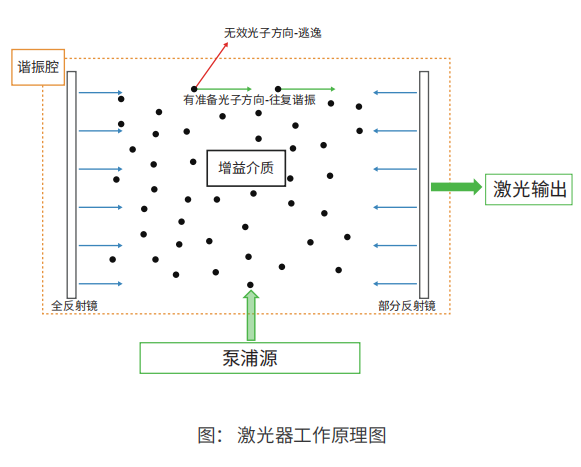 激光器工作時,由泵浦源向增益介質注入能量進行激勵,增益介質的電子受到能量激勵后發(fā)生能級躍遷,由基態(tài)躍遷至激發(fā)態(tài),由于激發(fā)態(tài)相較于基態(tài)是非穩(wěn)定狀態(tài),電子會自發(fā)地回歸到基態(tài),并放出光子。無數光子在諧振腔兩個斷面循環(huán),往復運動,不斷疊加,最終輸出方向、頻率高度一致、高能量的激光束。
