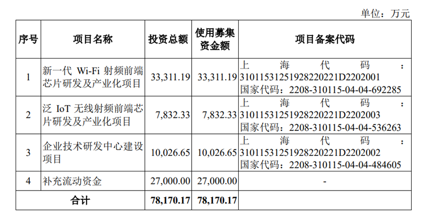 本次IPO,公司擬募資7.82億元,用于新一代Wi-Fi射頻前端芯片研發(fā)及產(chǎn)業(yè)化項(xiàng)目;泛IoT無(wú)線射頻前端芯片研發(fā)及產(chǎn)業(yè)化項(xiàng)目;企業(yè)技術(shù)研發(fā)中心建設(shè)項(xiàng)目和補(bǔ)充流動(dòng)資金。