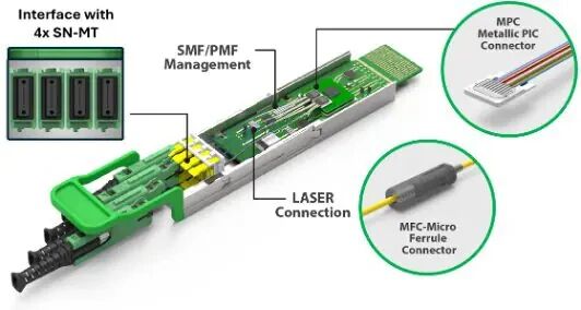 為了優(yōu)化光模塊內(nèi)部連接,SN-MT Mini 連接器可作為光模塊內(nèi)的理想接口,在保持緊湊性的同時(shí)不犧牲性能。此外,SENKO 的 Micro Ferrule Connector 為 SN-MT 連接器與通向光學(xué)芯片的光纖組件之間提供了直接接口。這有助于實(shí)現(xiàn)簡化的光纖路徑,同時(shí)確保精確的光纖對準(zhǔn)和最小的信號損失