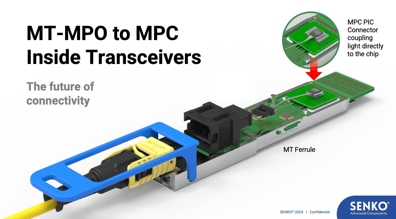 隨著光模塊技術(shù)的不斷發(fā)展,將光高效耦合到光學(xué)芯片的需求變得至關(guān)重要。SENKO 的金屬 PIC 連接器(MPC)可將光直接耦合到芯片中,實(shí)現(xiàn)高性能的數(shù)據(jù)傳輸,并將插入損耗降至最低。MPC 可以確保精確對準(zhǔn)和最佳光傳輸效果,使其成為下一代光模塊架構(gòu)中的關(guān)鍵組件。