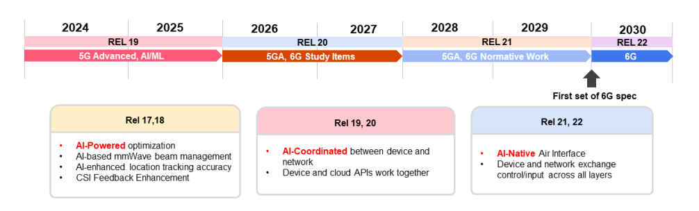 AI能力最早出現(xiàn)在3GPP Release 17版本中,并在Release 18中得到擴(kuò)展。未來的版本預(yù)計(jì)將從AI協(xié)同網(wǎng)絡(luò)(AI管理離散網(wǎng)絡(luò)功能)向AI原生架構(gòu)(AI深度嵌入整個(gè)網(wǎng)絡(luò)堆棧)過渡(圖1)。在6G時(shí)代,AI將滲透每一層,釋放前所未有的性能與自動(dòng)化水平。盡管3GPP標(biāo)準(zhǔn)并未覆蓋所有層級(jí),但創(chuàng)新正在貫穿整個(gè)網(wǎng)絡(luò)堆棧,部分供應(yīng)商和運(yùn)營(yíng)商已開始在網(wǎng)絡(luò)中直接部署AI模型。