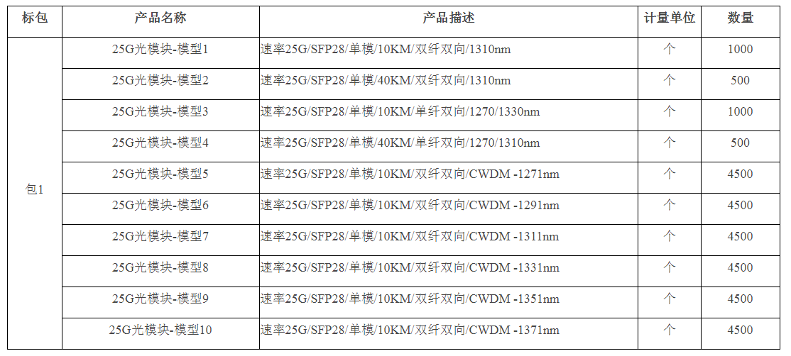 根據(jù)此前招標(biāo)公告顯示,該項(xiàng)目擬采購25G光模塊總數(shù)量約30000塊,最高總預(yù)算6780萬元(含稅),高于該限價的將否決投標(biāo)。中標(biāo)人數(shù)量為4個,具體中標(biāo)份額對應(yīng)為:30%、27.5%、22.5%、20%。