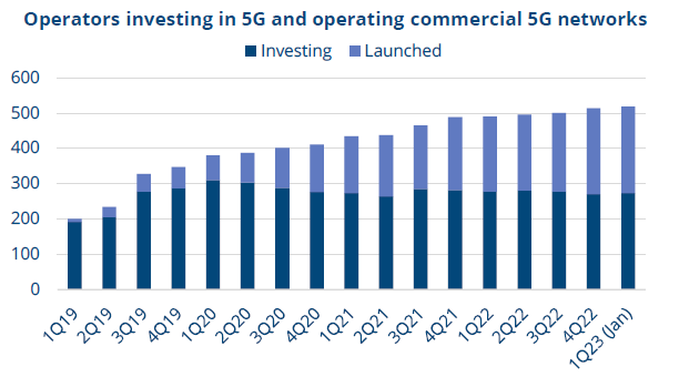 ICC訊(編譯:Nina)上周三(2023年2月15日),GSA發(fā)布最新5G市場數(shù)據(jù)。截至2023年1月底,GSA已確定全球有156個國家和地區(qū)的519家運(yùn)營商正在以包括試驗、購買許可證、規(guī)劃、部署網(wǎng)絡(luò)和商用的方式投資5G。這一數(shù)字不包括在美國拍賣CBRS頻譜時獲得優(yōu)先接入許可證的近200家公司,這些頻譜可能用于5G。