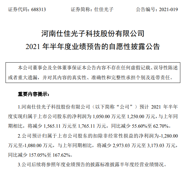 ICC訊 (編輯:Nicole) 河南仕佳光子科技股份有限公司(以下簡稱“仕佳光子”或“公司”)發(fā)布2021 年半年度業(yè)績預(yù)告:預(yù)計(jì)2021 年半年度實(shí)現(xiàn)歸屬于上市公司股東的凈利潤為 1,050.00 萬元至 1,250.00 萬元,與上年同期相比,將減少 1,565.11 萬元至 1,765.11 萬元,同比減少 55.60%至 62.70%;預(yù)計(jì)歸屬于上市公司股東的扣除非經(jīng)常性損益的凈利潤為-1,280.00 萬元至-1,080.00 萬元,與上年同期相比,將減少 2,973.03 萬元至 3,173.03 萬元,同比減少 157.05%至 167.62%。