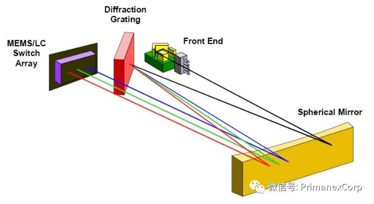 如果將分立器件之間的光纖連接換成光束在自由空間中傳播,也就是說僅在輸入端和輸出端存在光纖準(zhǔn)直和聚焦耦合,則以上傳統(tǒng)光纖級聯(lián)方案中的單一器件損耗多路疊加累積的弊端可以去除,而沒有了光纖盤繞半徑限制又可解放出大量的空間。這就是自由空間光學(xué)集成技術(shù)的精髓。圖五顯示的就是號稱無源光學(xué)器件領(lǐng)域“皇冠上的明珠”的WSS(波長可選擇光開關(guān))的光路示意圖,該產(chǎn)品就是自由空間光學(xué)集成技術(shù)的最好的體現(xiàn):光信號從輸入端光纖打入,經(jīng)準(zhǔn)直后在自由空間傳播,經(jīng)過一系列固定于對溫度不敏感的精密模板上的光學(xué)元件,然后耦合進(jìn)入輸出光纖。也就是說,對于某一傳輸鏈路而言,不管光路多么復(fù)雜,系統(tǒng)中只有一對準(zhǔn)直器的損耗和若干光學(xué)元件的透射和散射損耗。該款反射式1X4磁光開關(guān)就是基于此原理進(jìn)行的設(shè)計/開發(fā)。隨著通道數(shù)目增加,該技術(shù)方案相對于傳統(tǒng)光纖級聯(lián)方案的比較優(yōu)勢更為明顯,參見下表一。