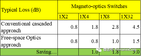表一:兩種技術(shù)方案的磁光開關(guān)損耗對比示意
