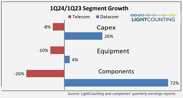 正如過去幾個季度的趨勢一樣,2024年第一季度(Q1 2024)光通信市場呈現(xiàn)出明顯的兩極分化,即電信部門銷售非常疲軟,同時超大規(guī)模的需求持續(xù)強勁。前15家通信服務(wù)提供商(CSP)的總資本支出連續(xù)第六個季度同比下降,而前15家互聯(lián)網(wǎng)服務(wù)提供商(ICP)的支出連續(xù)第二個季度增長,增幅最大的是谷歌(+91%)和微軟(+66%)。中國的ICP支出也大幅增加,這表明人工智能熱潮也在沖擊中國。