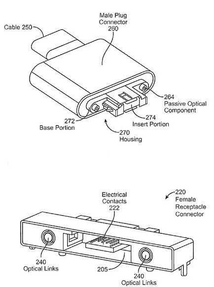 與光纖相比,傳統(tǒng)的電到傳輸方式卻非常普遍的使用。蘋果在專利中試圖將這兩種技術(shù)的優(yōu)點(diǎn)結(jié)合在一起,提出精簡(jiǎn)、兼容性高的解決方案?;旧蟻?lái)說(shuō),專利中提到的技術(shù)要比目前存在的技術(shù)高級(jí)一些,專利中提及的連接器可以同時(shí)傳輸電信號(hào)和光信號(hào)。