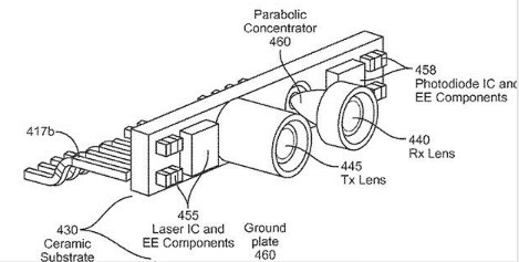 專利中提到,接收透鏡是一個(gè)拋物面聚光器,光收集要發(fā)送到的移動(dòng)設(shè)備上的一個(gè)光電二極管。這種設(shè)定允許較大直徑的光纖,約200至500微米,這反過(guò)來(lái)又提供了更大的公差對(duì)應(yīng)。作為對(duì)比,Thunderbolt鏈接協(xié)議使用兩個(gè)62.5微米的光纖。