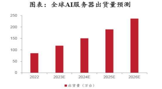 值得注意的是,大模型快速迭代及應(yīng)用落地強(qiáng)力拉升AI服務(wù)器需求。TrendForce預(yù)計(jì)2023年AI服務(wù)器出貨量同比增長38%,近120萬臺,占比約9%,至2026年份額約15%,4年出貨量CAGR達(dá)22%。AI大模型發(fā)展早期需求以訓(xùn)練型AI服務(wù)器為主,2021年占比57.33%,隨著生成式AI應(yīng)用推廣,推理型服務(wù)器有望逐步成為市場主流。