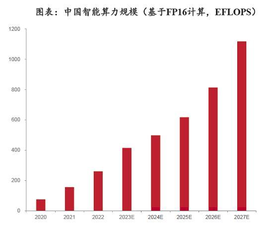 同時(shí),政策加大支持力度,引導(dǎo)產(chǎn)業(yè)規(guī)范發(fā)展。根據(jù)IDC測算,基于FP16,2022年中國智能算力規(guī)模259.9EFLOPS,預(yù)計(jì)2023年同比增速近60%,2027年將增至1117.4EFLOPS,2022-2027年CAGR達(dá)34%。
