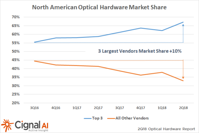 Cignal AI的首席分析師Andrew Schmitt表示:“北美地區(qū)的光網(wǎng)絡(luò)硬件支出在第二季度再次下降,但大型設(shè)備供應(yīng)商的表現(xiàn)在持續(xù)走好。在過去兩年中,該地區(qū)前三大光網(wǎng)絡(luò)設(shè)備商以較小的競爭對手為代價鞏固了10%的市場份額。在北美市場,小型光網(wǎng)絡(luò)設(shè)備商的處境已經(jīng)變得更加艱難。”