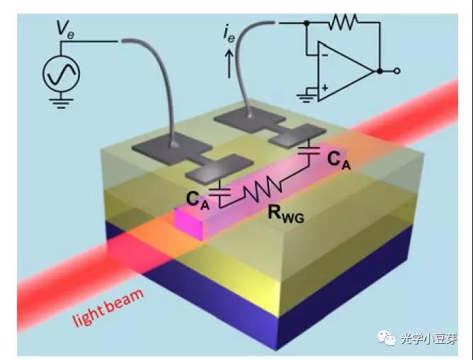 該方案在待測波導附近制作兩個金屬電極。將硅波導看成一根導線,由于Si-SiO2界面處存在表面態(tài)吸收(surface state absorption),導致波導內的載流子濃度會隨著波導內的光強變化而變化。而載流子濃度會影響電導率,利用這兩個金屬電極測出電導率的變化,進而知曉硅波導內光強的變化。實驗時,一個電極與交變電壓源相連,另一電極與跨阻放大器相連,用于接收信號。
