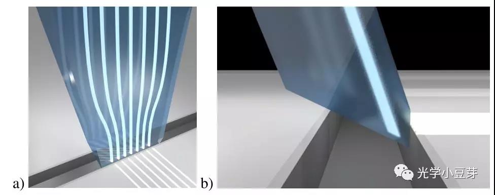 該方案使用端面斜切的PLC芯片。PLC芯片放置于端面的刻蝕槽中,光場在斜切處反射進硅波導中。其結構示意圖如下圖所示: