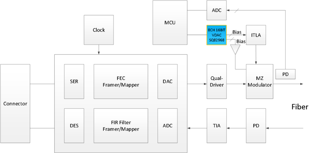光模塊應(yīng)用中有多種調(diào)制方式,以MZM等典型調(diào)制方式為例,該場景需要高精度DAC芯片提供精確的驅(qū)動(dòng)電流進(jìn)而實(shí)現(xiàn)準(zhǔn)確的功率控制,SQ82968可滿足光模塊應(yīng)用場景需求。在0.3Vheadroom條件下,SQ82968輸出30mA電流,能夠極大程度上降低對后級放大電路的要求。同時(shí)SQ82968具有極低的失調(diào)電壓誤差和,增益誤差以及優(yōu)秀的INL性能,可以使光模塊系統(tǒng)獲得極低的系統(tǒng)TUE (Total Unadjusted Error)。SQ82968支持復(fù)位實(shí)現(xiàn)輸出狀態(tài)可控。其在光模塊系統(tǒng)中的位置如圖所示。此外,SQ82968在需要TEC的場景,也可以用來控制電流進(jìn)而實(shí)現(xiàn)準(zhǔn)確的恒溫控制。