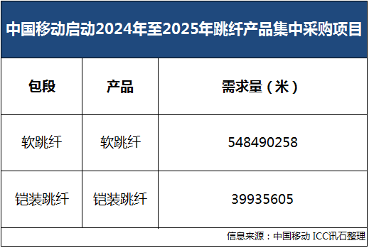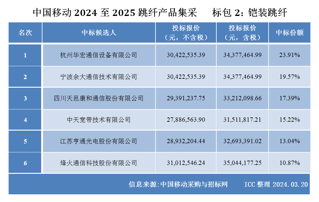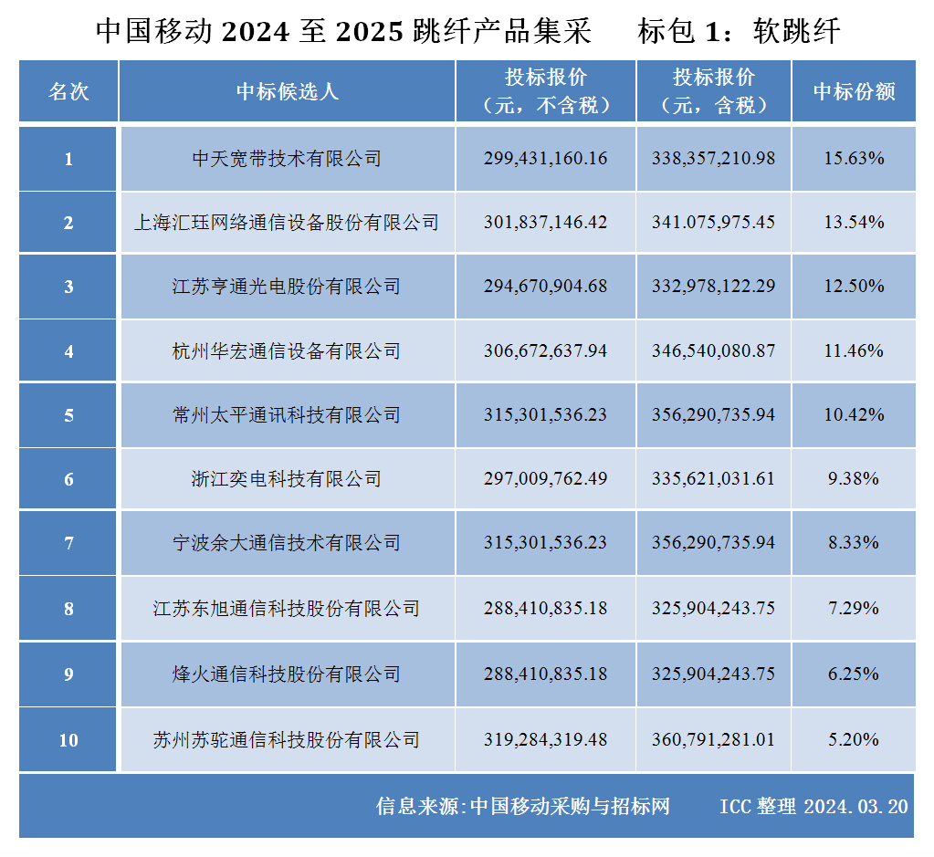 ICC訊 近日,中國(guó)移動(dòng)公示了2024年至2025年跳纖產(chǎn)品的集采結(jié)果,中天、亨通、烽火等十一家廠商中標(biāo)。