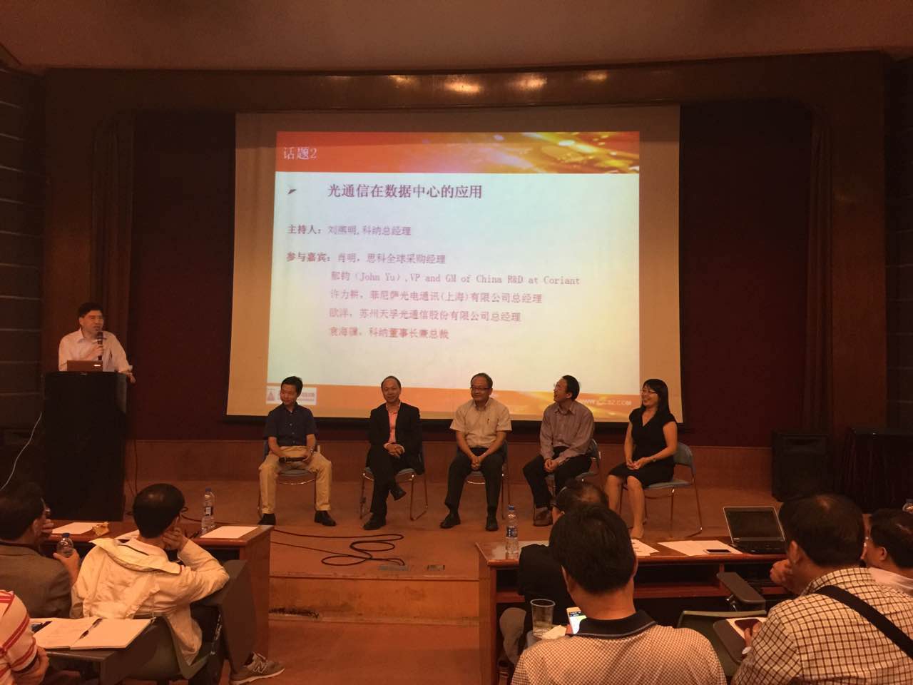 會(huì)議在緊鑼密鼓中迎來(lái)了壓軸的話題二討論環(huán)節(jié)——光通信在數(shù)據(jù)中心的應(yīng)用,該話題由特邀主持嘉賓科納總經(jīng)理劉燕明博士主持,思科全球采購(gòu)經(jīng)理肖明,Coriant中國(guó)區(qū)VP兼GM郁鈞(John Yu),菲尼薩光電通訊(上海)有限公司總經(jīng)理許力耕,科納董事長(zhǎng)兼總裁袁海驥,以及蘇州天孚光通信股份有限公司總經(jīng)理歐洋作為參與嘉賓出席了討論。