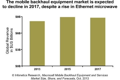 Infonetics預(yù)計(jì)2013年全球宏蜂窩移動(dòng)回程設(shè)備市場將到達(dá)81億美元,同比2012年僅增長1%;