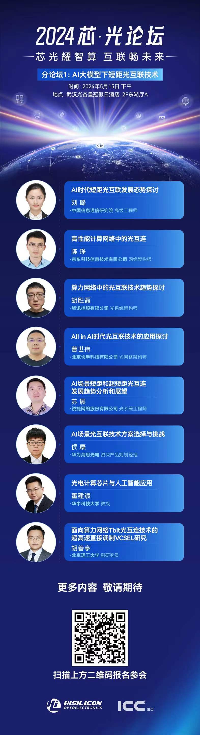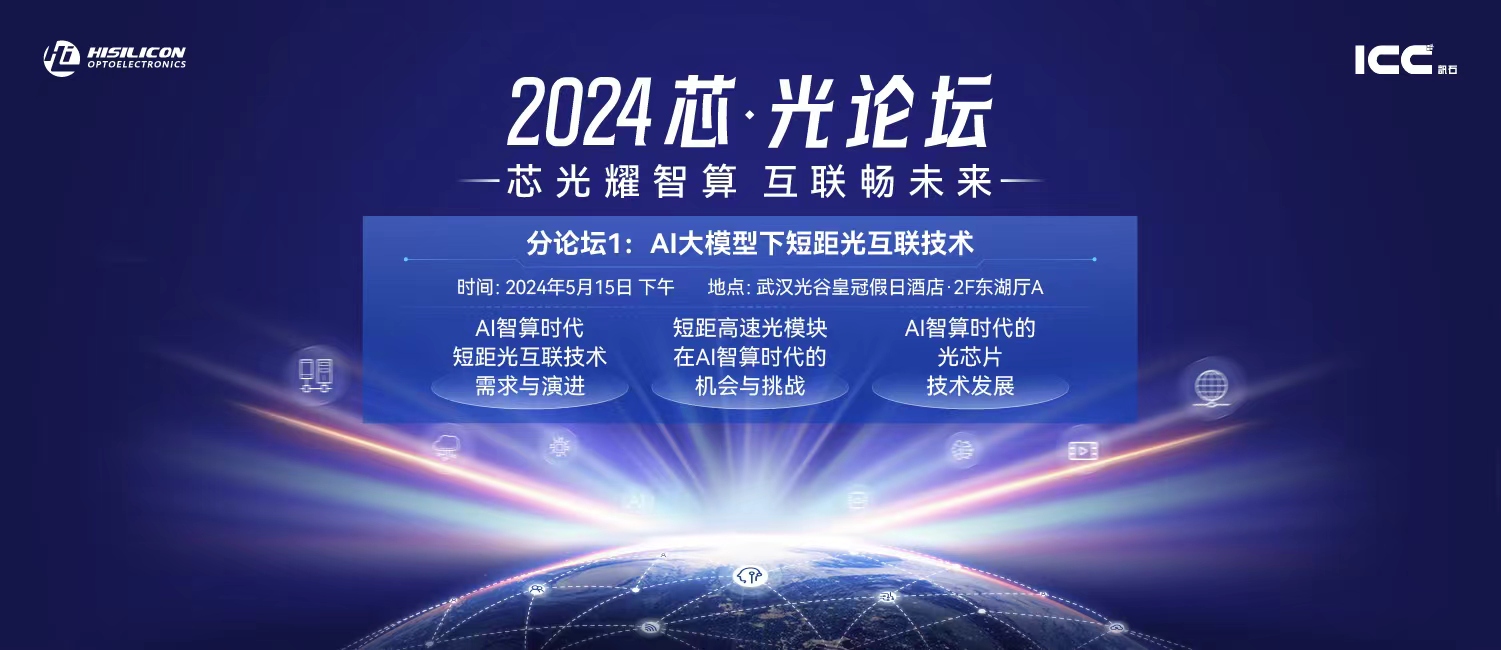 ICC訊 2024年5月14-15日,由華為海思光電主辦,ICC訊石承辦的“2024芯?光論壇:芯光耀智算 互聯(lián)暢未來(lái)”會(huì)議將在武漢光谷皇冠假日酒店舉行。