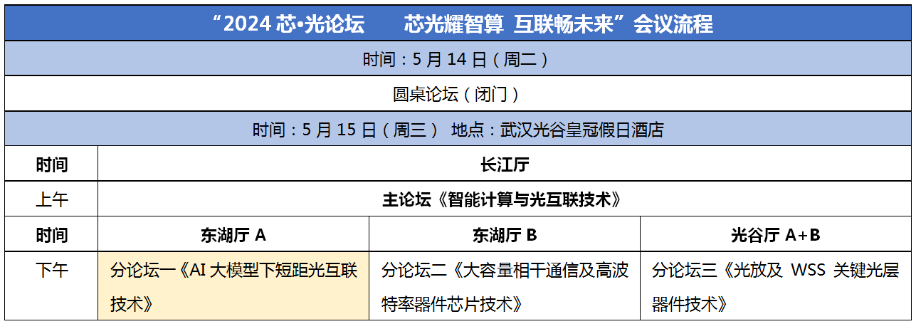 本次會(huì)議于5月14日下午設(shè)有閉門圓桌論壇,5月15日設(shè)有1場(chǎng)大會(huì)報(bào)告和3場(chǎng)平行論壇。此次大會(huì)報(bào)告將聚焦智能計(jì)算與光互聯(lián)技術(shù)的技術(shù)發(fā)展,分論壇分別探討AI大模型下短距光互聯(lián)技術(shù)、大容量相干通信及高波特率器件芯片技術(shù)、光放及WSS關(guān)鍵光層器件技術(shù),分享產(chǎn)業(yè)技術(shù)創(chuàng)新與學(xué)術(shù)前沿進(jìn)展。