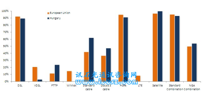 現(xiàn)在匈牙利能夠很好地將超高速覆蓋增加到70%或超過這一數(shù)字,因?yàn)?A href="http://www.tulsarestaurantguide.com/site/CN/Search.aspx?page=1&keywords=%e5%8c%88%e7%89%99%e5%88%a9&column_id=ALL&station=%E5%85%A8%E9%83%A8" target="_blank">匈牙利現(xiàn)有網(wǎng)絡(luò)還沒有被充分應(yīng)用起來。雖然基本cable TV網(wǎng)絡(luò)在匈牙利覆蓋了62%的家庭,但使用Docsis 3技術(shù)的超高速cable寬帶僅僅覆蓋47%的家庭。同樣DSL,在電話網(wǎng)絡(luò)上使用寬帶的技術(shù),在匈牙利覆蓋了89%的家庭,但VDSL(可以代替DSL的超高速技術(shù))覆蓋不到3%。升級這兩種現(xiàn)有寬帶能夠讓匈牙利在相對較低成本的基礎(chǔ)上更好地改善寬帶覆蓋。