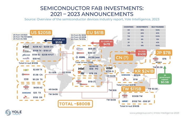 Yole Intelligence (Yole Group的一部分)首席分析師Pierre Cambou表示:“外國直接投資(Direct Foreign Investment,DFI)占了剩余部分。臺積電在亞利桑那州投資400億美元的晶圓廠建設(shè)是最重要的項(xiàng)目之一,其次是三星(250億美元)、SK海力士(150億美元)、恩智浦(26億美元)、博世(15億美元)和X-Fab(2億美元)?!?