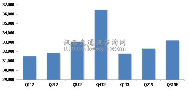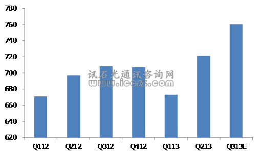 上圖中統(tǒng)計(jì)的主要設(shè)備商包括:思科、愛(ài)立信、阿朗、諾西、富士通、Juniper、Ciena、Tellabs和ADTRAN。設(shè)備商及華爾街分析師財(cái)測(cè)數(shù)據(jù)顯示,Q313主流設(shè)備商營(yíng)收同比微幅增長(zhǎng)0.3%,環(huán)比增長(zhǎng)2.6%,增長(zhǎng)主要來(lái)自思科、愛(ài)立信和阿朗。同時(shí),諾西由于退出了部分業(yè)務(wù)領(lǐng)域,富士通則是季節(jié)性因素,三季度營(yíng)收同比減少。思科認(rèn)為行業(yè)處于“緩慢和持續(xù)的復(fù)蘇”狀態(tài)。