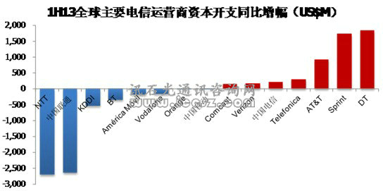 上圖中15家運(yùn)營(yíng)商2013年上半年資本開(kāi)支整體下滑12.38億美元。減幅最大的為NTT和中國(guó)聯(lián)通,增幅最大的為德國(guó)電信和Sprint。而這兩家資本開(kāi)支的增長(zhǎng)主要是用于LTE網(wǎng)絡(luò)覆蓋。欲知更多詳情,歡迎訂購(gòu)訊石三季度報(bào)告。