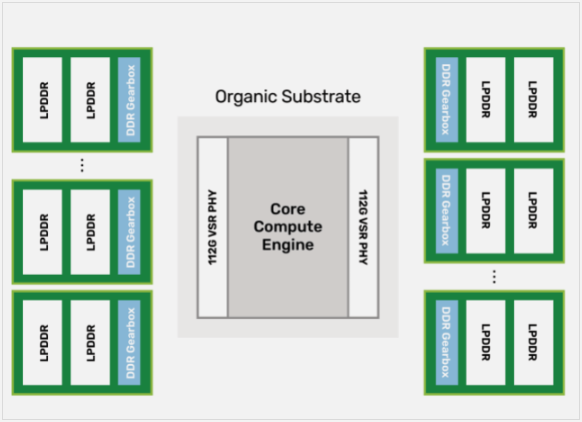 他表示,過去解決這一問題的方法是在推理IC周圍的大型基板上放置LPDDR內(nèi)存。"這種方法受限于基板上能容納多少內(nèi)存。"最多只能配置16個內(nèi)存堆棧,容量上限為256GB內(nèi)存和1.3TB帶寬。"最終結(jié)果是芯片的所有接口都被內(nèi)存占據(jù)。"Barnetson說。