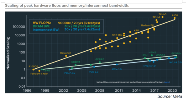Meta基礎(chǔ)設(shè)施副總裁Alexis Bjorlin的主題演講,明確了峰會(huì)議程的重點(diǎn),包括AI硬件、軟件和包括光連接在內(nèi)的所有支持技術(shù)。Alexis在她的主題演講中總結(jié)了AI硬件和架構(gòu)的發(fā)展,包括下圖。它清楚地表明,DRAM和互連的帶寬進(jìn)步遠(yuǎn)遠(yuǎn)落后于計(jì)算硬件的進(jìn)步。這種情況必須改變。