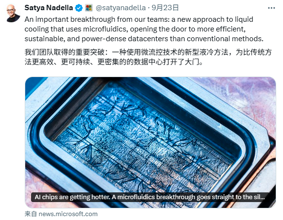 ICC訊 微軟董事長兼首席執(zhí)行官Satya Nadella在社交媒體宣布,微軟團(tuán)隊取得了一項巨大突破:一種使用微流控技術(shù)的新型液冷方法,為比傳統(tǒng)方法更高效、更可持續(xù)、更密集的的數(shù)據(jù)中心打開了大門。
