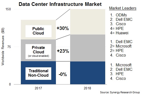 在市場份額方面,ODM占公共云市場的最大部分,戴爾EMC是領(lǐng)先的個體供應(yīng)商,其次是思科,HPE和華為。私有云的2018年市場領(lǐng)導(dǎo)者是戴爾EMC,其次是微軟,HPE和思科。同樣的四家供應(yīng)商在非云數(shù)據(jù)中心市場占據(jù)領(lǐng)先地位,但排名不同。