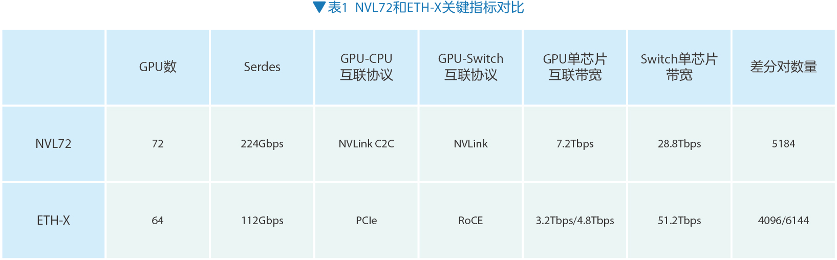 NVL72和ETH-X超節(jié)點(diǎn)都可以提供高帶寬、低時(shí)延、大內(nèi)存空間的Scale-up網(wǎng)絡(luò)擴(kuò)展。NVL72方案采用NVLink和NVLink C2C連接,超節(jié)點(diǎn)內(nèi)的GPU之間的內(nèi)存都可以互訪。ETH-X采用開(kāi)放的以太網(wǎng)解決方案,優(yōu)點(diǎn)是生態(tài)開(kāi)放,可以推廣為ODCC組織的一個(gè)標(biāo)準(zhǔn),不過(guò)由于沒(méi)有NVLink這種類總線的協(xié)議,ETH-X后續(xù)還需要進(jìn)行內(nèi)存語(yǔ)義支持的開(kāi)發(fā)。兩種超節(jié)點(diǎn)的關(guān)鍵指標(biāo)對(duì)比如表1所示。