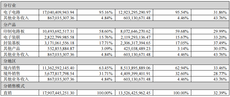 深南電路產(chǎn)品包括印刷電路板(PCB)業(yè)務(wù)、封裝基板業(yè)務(wù)、電子裝聯(lián)業(yè)務(wù),2024年營收分別為104.94億元,、31.71億元和28.23億元。其中,在印刷電路板(PCB)業(yè)務(wù)收入同比增長29.99%,占公司營業(yè)總收入的58.6%;毛利率31.62%,同比增加5.07%。