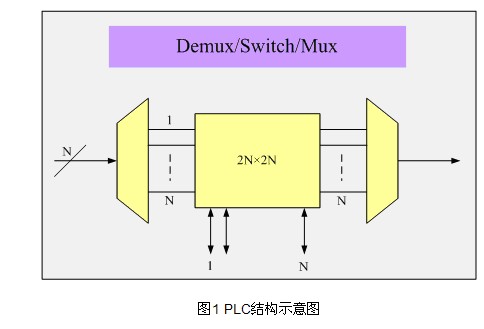 平面光波電路ROADM是一種基于硅工藝的集成電路,可以集成多種器件,如光柵、分路器以及光開關(guān)等。它通過集成的陣列光波導(dǎo)(AWG)實現(xiàn)波長復(fù)用和解復(fù)用,集成的光開關(guān)實現(xiàn)波長直通或阻斷并加入(Block-and-Add),可變光衰耗器(VOA)實現(xiàn)每通道的光功率動態(tài)均衡。PLC ROADM上下路的通道是彩色光,這意味著只有預(yù)定義的彩色波長可以在每個端口上下,并可配合可調(diào)濾波器和可調(diào)激光器使用。由于PLC的集成特性,使其成為低成本的ROADM解決方案之一。圖1所示為PLC的結(jié)構(gòu)示意圖。