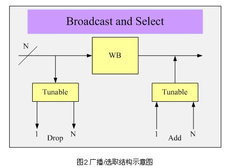 波長阻斷器用阻斷下路波長通過來實現(xiàn)功能,它可以支持較多的光通道數(shù)和較小的通道間隔,具有較低的色散,并可實現(xiàn)多個器件的級聯(lián),易于實現(xiàn)光譜均衡。但波長阻斷器需要額外的上下路模塊來構(gòu)建系統(tǒng),上下路配合可調(diào)濾波器和可調(diào)激光器。從本質(zhì)上講,WB是一個二維器件,通常在構(gòu)建系統(tǒng)中由多個分立器件構(gòu)成,體積較大,但可以支持100GHz和50GHz的波道間隔,并且技術(shù)成熟,成本較低,因此適合用于LH和ULH系統(tǒng)。圖2所示的是廣播/選取結(jié)構(gòu)示意圖。