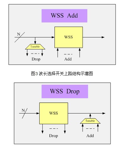 波長選擇交換器(WSS)是近年來發(fā)展迅速的ROADM子系統(tǒng)技術(shù)。WSS基于MEMS光學(xué)平臺,具有頻帶寬、色散低,并且同時支持10/40Gbit/s光信號的特點和內(nèi)在的基于端口的波長定義(Colorless)特性。采用自由空間光交換技術(shù),上下路波數(shù)少,但可以支持更高的維度,集成的部件較多,控制復(fù)雜?;赪SS的ROADM逐漸成為4度以上ROADM的首選技術(shù)。圖3、圖4所示的是波長選擇開關(guān)上下路結(jié)構(gòu)示意圖。