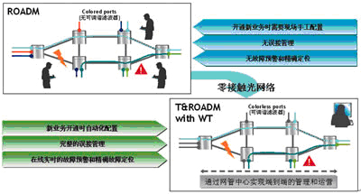 上海貝爾憑借在控制平面上的經(jīng)驗(yàn),結(jié)合ROADM技術(shù),在WDM網(wǎng)上推出了zerotouch的理念和解決方案(如圖所示),zerotouch通過光交換技術(shù)與控制平面技術(shù)的結(jié)合,只要坐在中央網(wǎng)管中心,在計(jì)算機(jī)上點(diǎn)擊操作就可開通新業(yè)務(wù),實(shí)現(xiàn)與現(xiàn)場(chǎng)零接觸,同時(shí)能夠大大提高網(wǎng)絡(luò)的可靠性、適應(yīng)性,加快開通新業(yè)務(wù)的速度,免去了傳統(tǒng)的大量人員去現(xiàn)場(chǎng)手工安裝調(diào)試的程序,降低了運(yùn)營(yíng)成本。在原有的WDM系列產(chǎn)品的基礎(chǔ)上,建立在獨(dú)一無二的零接觸光傳送技術(shù)上的上海貝爾1830 PSS將會(huì)進(jìn)一步強(qiáng)化在戰(zhàn)略性的、快速增長(zhǎng)的WDM網(wǎng)絡(luò)市場(chǎng)上的領(lǐng)先地位。